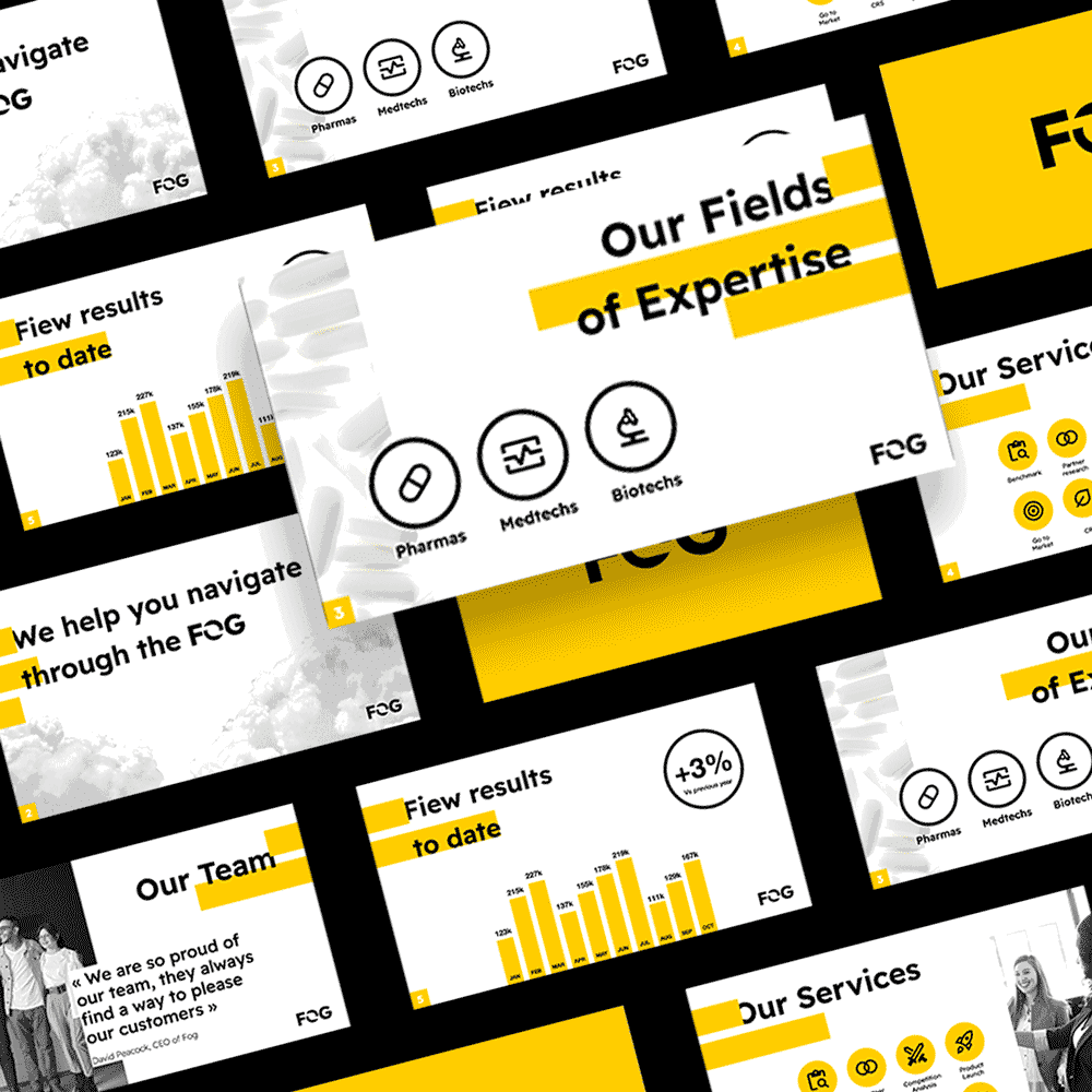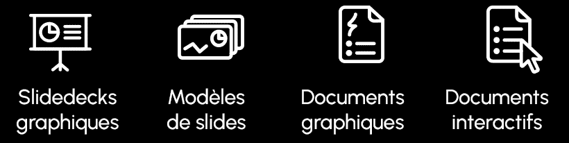 Qui a dit que les slides de présentation devaient forcément être moches et chargées ? Chez Blackscratch, nous nous assurons que vos présentations et modèles de slides (PowerPoint, Keynote…) soient clairs, impactants et jolis, c’est quand même plus sympa !